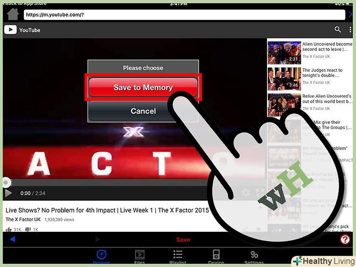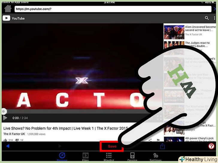 Введіть назву відео і натисніть на кнопку "Save" (Зберегти).відео з YouTube буде завантажено в папку "файли". Ця папка знаходиться в папці програми-завантажувача. Ви зможете зайти в неї в будь-який час, з наявністю Інтернет-з'єднання або без нього.[2]