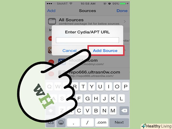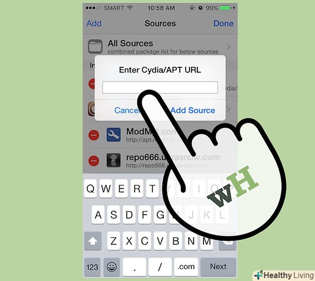 Виберіть Add/Додати, а потім введіть посилання на джерело, з якого хочете безкоштовно завантажити Платні додатки.безкоштовні платні програми містяться в сховищах і каталогах додатків. Приклади великих сховищ додатків: AppCake (cydia.iphonecake.com), Sinful iPhone (sinfuliphonerepo.com) і xSellize (cydia.xsellize.com).[2]