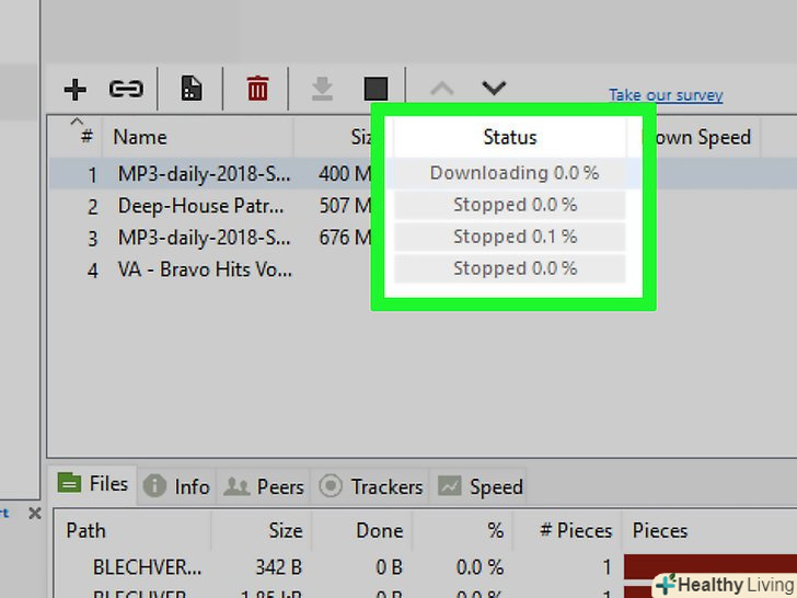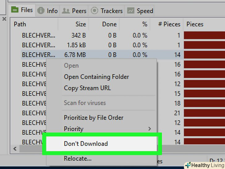 Не завантажуйте непотрібні файли. коли торрент відкривається в uTorrent, у вікні цього торрент-клієнта з'являється вікно зі списком всіх файлів торрента. Зніміть прапорці у файлів, які ви не хочете завантажувати, щоб прискорити процес завантаження.- Як правило, у менш популярних файлів (наприклад, навчальних посібників або деінсталяторів), які включені в торрент, набагато менше індивідуальних Сідов. Низьке число таких сидов знижує швидкість скачування всього файлу, тому зніміть прапорці у непотрібних файлів, щоб прискорити завантаження.