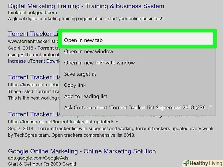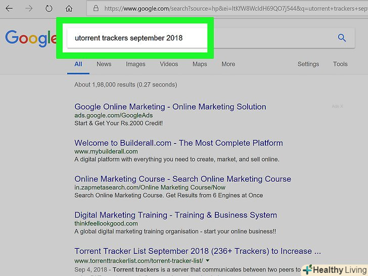 Знайдіть активні трекери. В пошуковій системі введіть список трекерів для торрентів [місяць] [рік] натисніть ↵ Enter. Замість [місяць] введіть поточний місяць, а замість [рік] — поточний рік (наприклад, список трекерів для торрентів грудень 2018).