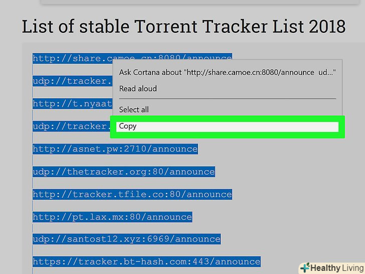 Скопіюйте список трекерів. утримуйте кнопку миші і проведіть покажчиком по всіх трекерів, щоб вибрати їх, а потім натисніть Ctrl+C (Windows) або ⌘ Command+C (Mac), щоб скопіювати їх.- Трекери являють собою веб-адреси.