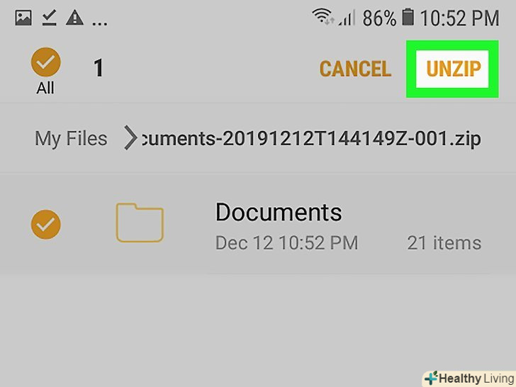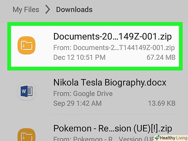 ТоркнітьсяВитягти. Папка буде витягнута з ZIP-файлу і з'явиться в папці «Завантаження». Натисніть на ім'я папки, щоб отримати доступ до її файлів.