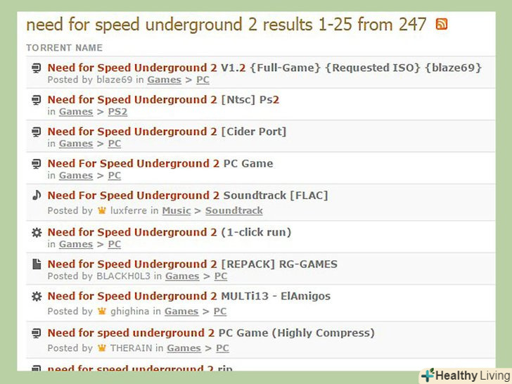 Знайдіть торрент-файл потрібної вам гри.це можна зробити на численних торрент-трекерах. Переконайтеся, що торрент-файл має багато позитивних коментарів; в іншому випадку файл може містити вірус.- Знайдіть торрент з великим числом Сідов (це користувачі, які роздають потрібну вам гру). Чим більше Сідов, тим швидше ви завантажите гру.