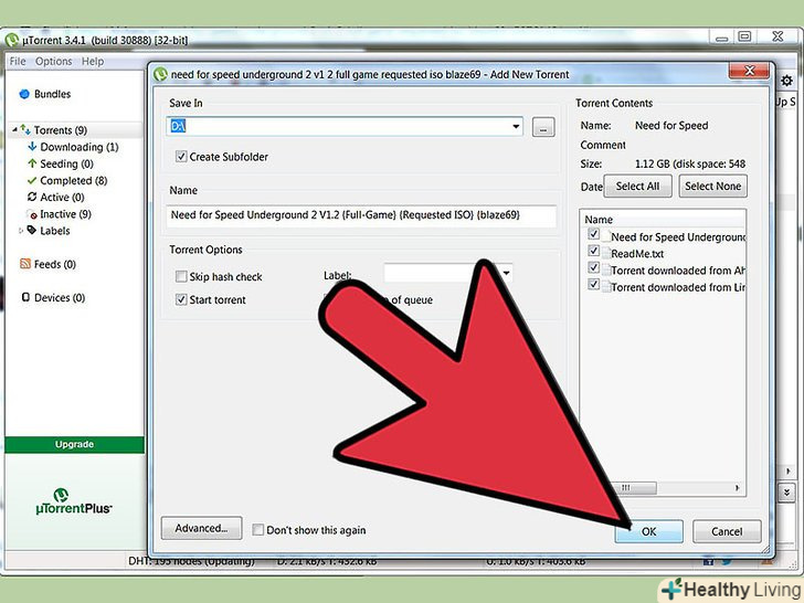 Скачайте торрент-файл і відкрийте його в торрент-клієнті.торрент-файли мало важать і викачуються буквально за пару секунд. Це відбувається тому, що торрент-файл містить мінімум інформації, необхідної для знаходження і скачування потрібної вам гри з комп'ютерів інших користувачів (по частинах, які з'єднуються в кінці завантаження).- Завантажувані торрент-файли повинні автоматично відкриватися в торрент-клієнті; якщо цього не сталося, клацніть по файлу, щоб запустити його завантаження в клієнті, або натисніть на торрент-файл і в контекстному меню «Відкрити за допомогою» в списку програм виберіть потрібний торрент-клієнт.