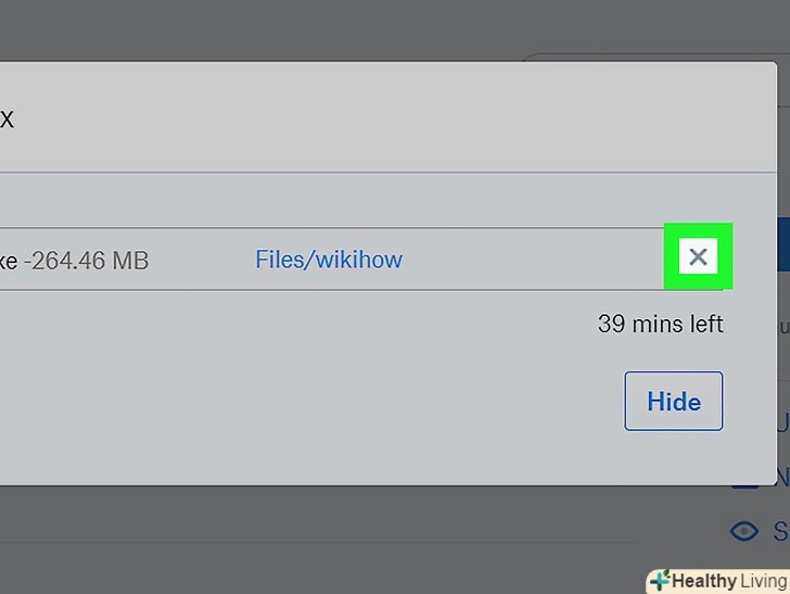 Клацніть поX. ви знайдете цей значок над кнопкою "приховати" в правому нижньому кутку спливаючого вікна. Так ви скасуєте всі заплановані завантаження в Dropbox.