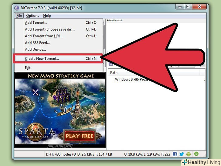 Створіть торрент.у торрент-клієнті відкрийте спеціальну утиліту для створення торрентів. Для цього в більшості випадків просто натисніть Ctrl + N.- Додайте файл, яким ви хочете поділитися з іншими користувачами. Якщо ви хочете поділитися відразу декількома файлами, створіть папку, а потім додайте її в торрент.