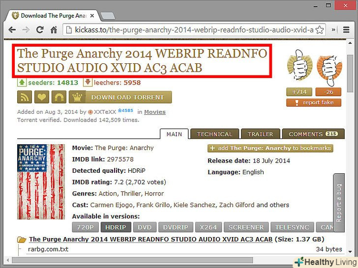 - Подивіться на розміри файлів, особливо якщо ви завантажуєте фільми – чим менше розмір, тим гірше якість зображення. Якщо вам потрібно якісне зображення, виберіть файл великого розміру з великим числом сидів. Про якість зображення можна дізнатися з коментарів.