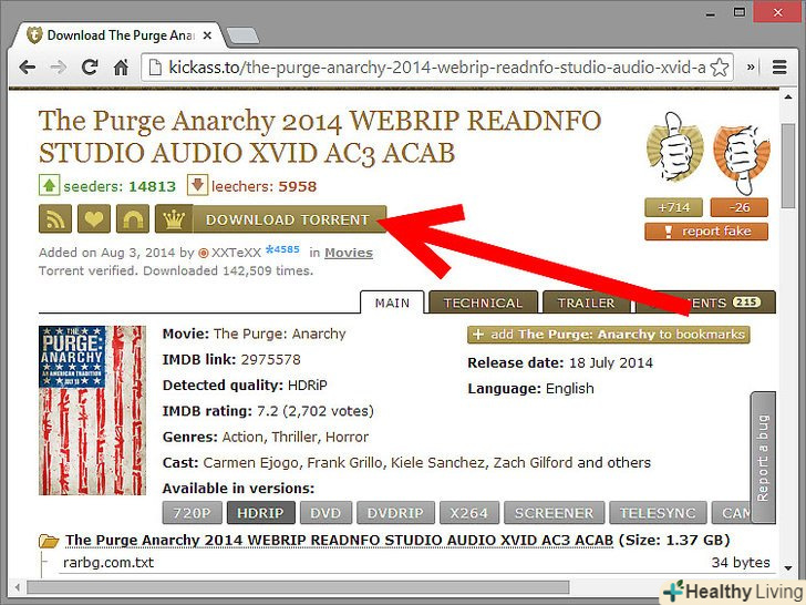 Щоб завантажити торрент натисніть «Завантажити» (у списку результатів пошуку; виглядає як невелика стрілка) або натисніть «Завантажити торрент» (у верхній частині сторінки торрента).- Торренти-це файли невеликого розміру, що містять інформацію для скачування потрібного вам файлу (фільму, музики та інших).
