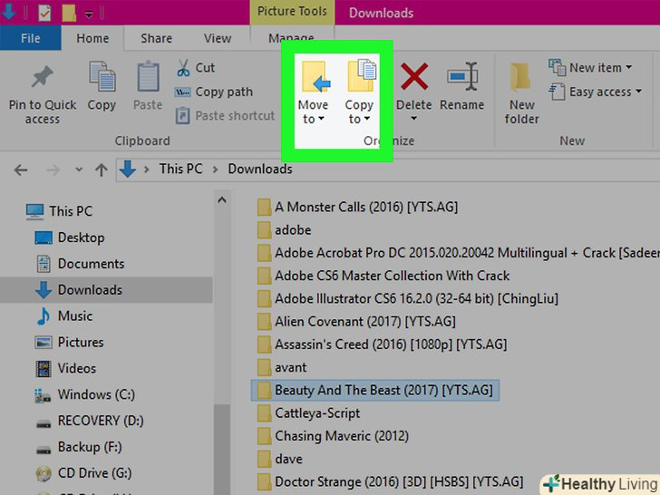 Натисніть на опціюКопіювати в або Перемістити в.обидві опції знаходяться в меню "Упорядкувати" на панелі інструментів вгорі вікна провідник.- Копіювати в