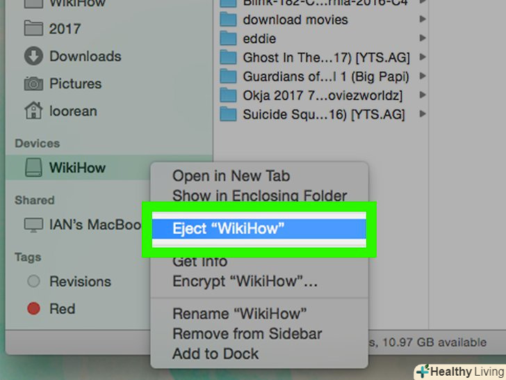 Натисніть на кнопку "Витягти". це вказує вгору стрілка праворуч від імені флешки у вікні Finder. Натисніть на неї, коли перенесення фільму буде завершено, а потім витягніть флешку, щоб завершити процес.