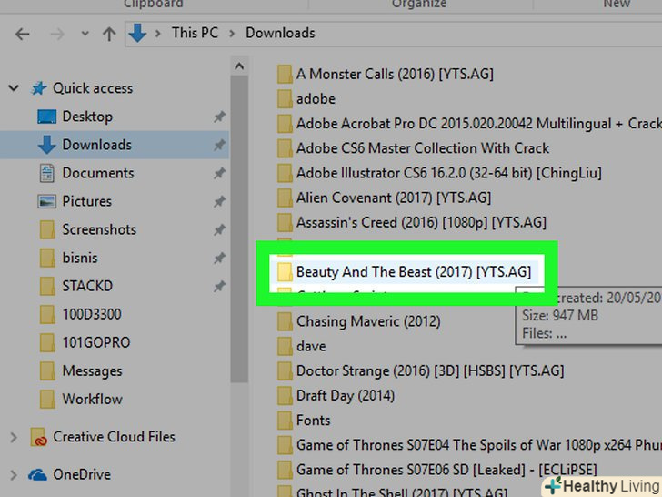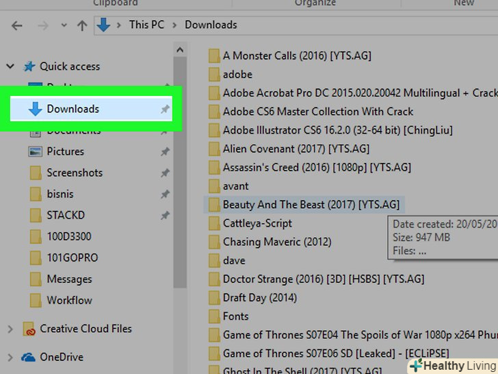 Відкрийте папку, в якій знаходиться фільм.виберіть потрібну папку в лівій частині вікна Провідника.- Наприклад: якщо за замовчуванням браузер завантажує файли в папку «завантаження», відкрийте її.