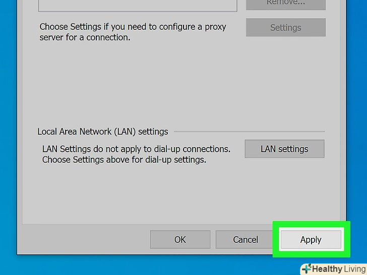 НатиснітьЗастосувати. Внесені зміни вступлять в силу. Тепер інтернетом можна користуватися анонімно (можливо, вам доведеться перезапустити браузер Chrome).- Налаштування вікна "Властивості Інтернету" (Windows) автоматично застосовуються до браузера Internet Explorer (IE), тому проксі-сервер буде активований як в Chrome, так і в IE.