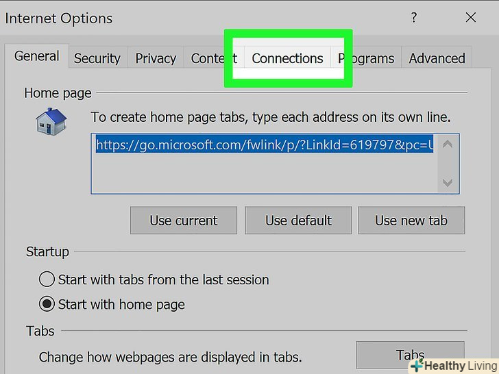 Клацніть по вкладціПідключення. вона знаходиться у верхній частині вікна "Властивості оглядача".