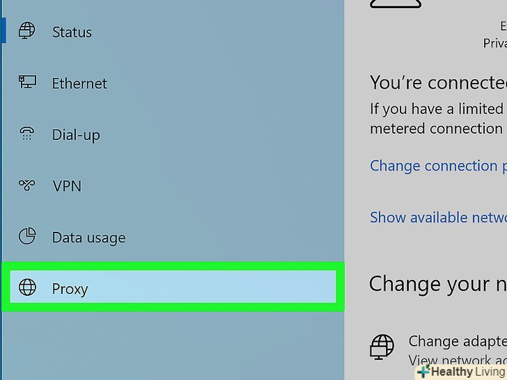 Клацніть по вкладціПроксі-сервер. вона знаходиться в нижній частині лівої панелі вікна»Мережа та інтернет".- Можливо, щоб знайти зазначену опцію, вам доведеться прокрутити вниз вміст лівої панелі.