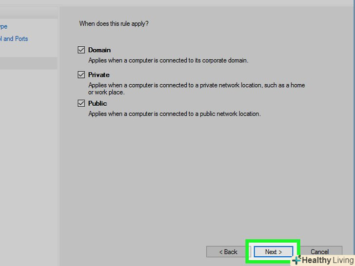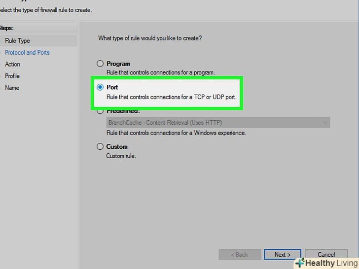 Поставте прапорець біля опції "для порту", а потім натиснітьДалі.так ви зможете вибрати порти, які потрібно відкрити.