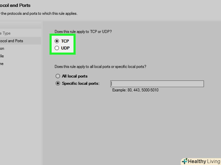 Виберіть опцію "Протокол TCP" або»Протокол UDP".для цього поставте прапорець біля потрібної опції. На відміну від більшості маршрутизаторів, тут потрібно вибрати один з двох протоколів, щоб створити правило.- Почитайте документацію до програми, щоб з'ясувати, який протокол вибрати.