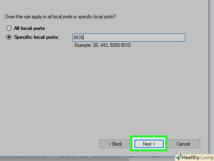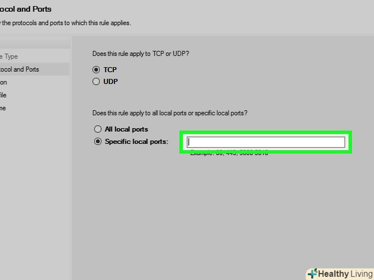 Введіть діапазон портів.поставте прапорець біля опції "певні локальні порти", а потім введіть номери портів, які потрібно відкрити. Можна відкрити кілька окремих портів, розділивши їх комою, або можна ввести діапазон портів, використовуючи тире між номерами першого і останнього порту.- Наприклад, введіть8830, щоб відкрити порт 8830; введіть 8830, 8824, щоб відкрити порт 8830 і порт 8824; введіть 8830-8835, щоб відкрити порти з 8830 по 8835.