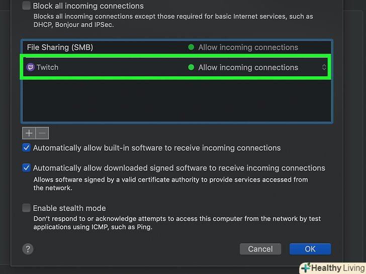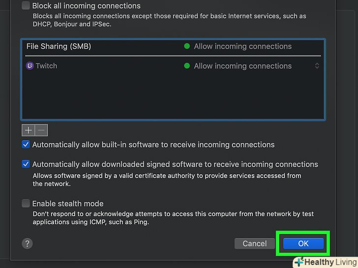 Переконайтеся, що поруч з назвою програми відображається повідомлення»дозволити вхідні з'єднання". якщо праворуч від назви програми немає такого повідомлення, затисніть Control, клацніть по назві програми, а потім натисніть «Дозволити вхідні підключення».