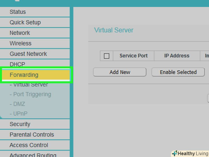Знайдіть розділ "Port Forwarding" (переадресація портів).інтерфейс налаштувань модему залежить від моделі пристрою. Тому вказаний розділ шукайте на наступних вкладках:- » Port Forwarding " (Перефдресація портів);