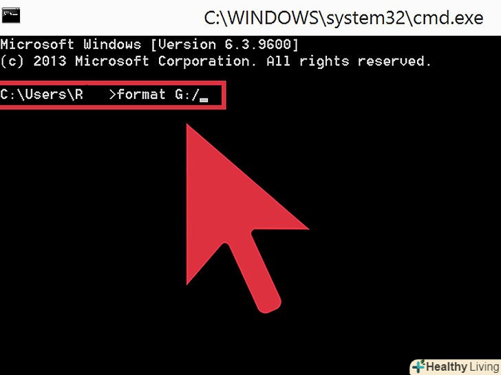 Відформатуйте флеш-диск. натисніть Start gt;Run, потім напишіть cmd і натисніть клавішу введення. У діалоговому вікні напишіть format (буква, що позначає диск). Переконайтеся, що точно вказали букву, що позначає саме флеш-диск.- Щоб визначити, яка буква позначає флеш-диск, відкрийте папку My computer і знайдіть флеш-диск. Він може бути вказаний, наприклад, як USB jump drive (E:). У цьому випадку E позначає флеш-диск. На вашому комп'ютері буква може бути іншою, вона залежить від кількості дисків.