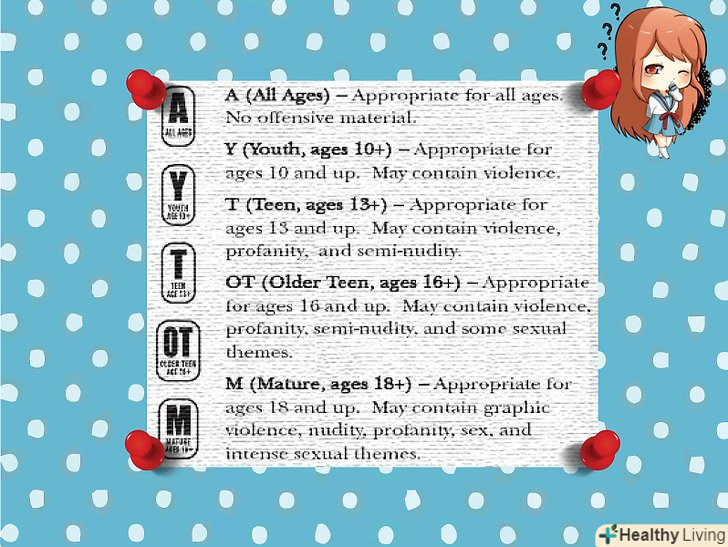Вивчіть рейтингову систему.оскільки деякі манга містять теми дорослого характеру, існує рейтингова система, аналогічна тій, що існує у комп'ютерних ігор і кінофільмів. Американські видавці використовують такі рейтинги:- A (для будь-якого віку)