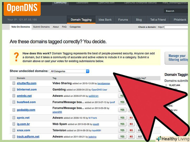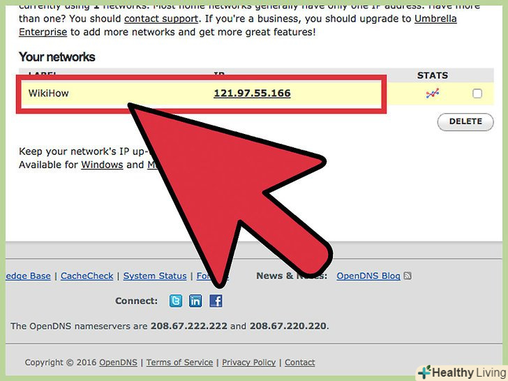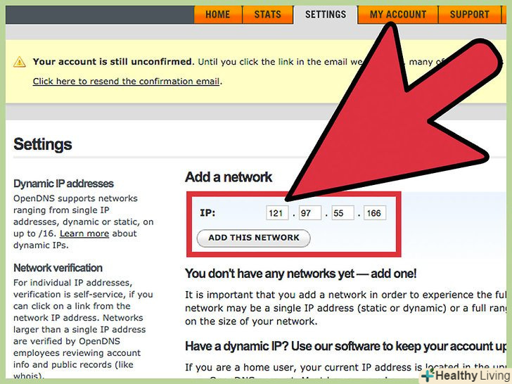 Клацніть по вкладці "Settings" (Налаштування) і введіть IP-адресу домашньої мережі. IP-адреса відобразиться у верхній частині панелі управління. Введіть цю адресу в поле " Add a network "(Додати мережу). В цьому випадку OpenDNS буде реєструвати трафік з вашої мережі і блокувати сайти.- Вам доведеться підтвердити свою мережу за допомогою електронного листа, який буде відправлено на електронну адресу, введену вами при реєстрації на OpenDNS.