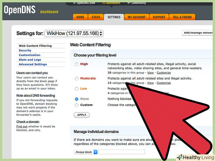 Виберіть один з попередньо встановлених рівнів фільтрації (якщо хочете). виберіть "Low «(низький),» Medium «(середній) або» High" (високий) рівень. Майте на увазі, що OpenDNS регулярно оновлює списки заблокованого вмісту.