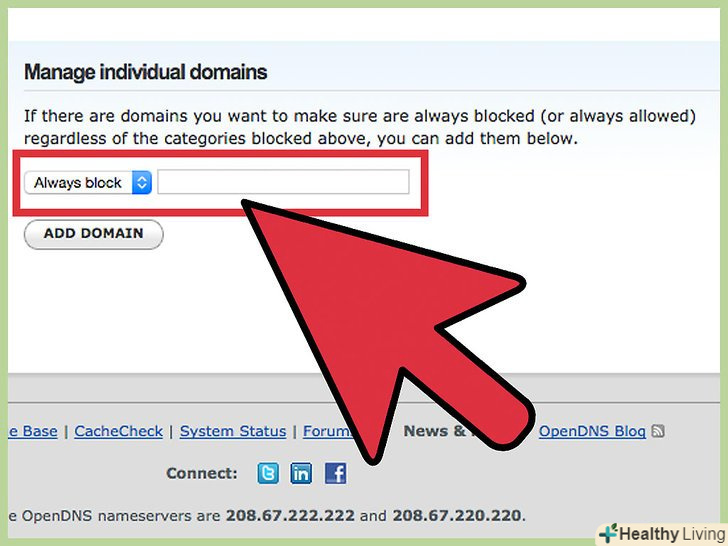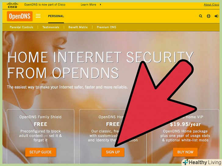 Підпишіться на безкоштовний план OpenDNS Home.щоб заблокувати певні сайти, краще скористатися сервісом OpenDNS, ніж змінювати налаштування маршрутизатора. Це пов'язано з тим, що більшість домашніх маршрутизаторів не блокують сайти з префіксом https:// (зашифровані сайти), причому зашифрованих сайтів стає все більше. OpenDNS може фільтрувати зашифровані сайти для всіх користувачів у вашій мережі.[2]- Безкоштовно зареєструватися можна на сторінціopendns.com/home-internet-security / .