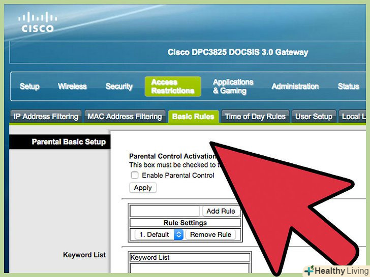 Знайдіть розділ " URL Filtering "(фільтрація) або» Blocking " (блокування). розташування цієї опції залежить від моделі маршрутизатора; швидше за все, ви знайдете її в меню «Firewall» (брандмауер) або в розділі «Security» (Безпека).[1]