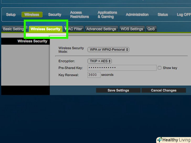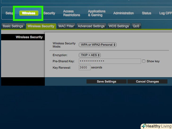 Клацніть по вкладціWireless (Бездротова мережа). якщо ви не бачите цю вкладку, перейдіть на вкладку «Setup» (налаштування) і натисніть " Wireless Settings "(Налаштування бездротової мережі) в меню зліва.