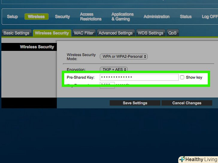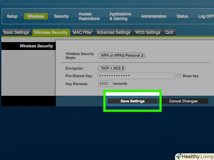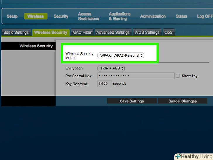 Натисніть < span class="nowrap" title="This is not a clickable button; it illustrates the button one should find." style="font-family: Segoe UI, Frutiger, Frutiger Linotype, Dejavu Sans, Helvetica Neue, Arial, sans-serif;letter-spacing:0px;padding:0em .6em; border:1px solid; border-color:#AAA #555 #555 #AAA; -moz-border-radius: 0px; -webkit-border-radius: 0px; border-radius: 0px; background-color: #F2F2F2; background-image: -moz-linear-gradient(top, #FCFCFC, #E0E0E0); background-image: -o-linear-gradient(top, #FCFCFC, #E0E0E0); background-image:-webkit-linear-gradient(top, #FCFCFC, #E0E0E0); background-image: linear-gradient(top, #FCFCFC, #E0E0E0);">Enable WPA2 Wireless Security (активувати протокол безпеки WPA2).якщо ви не збираєтеся підключати до мережі старі пристрої, які не підтримують WPA2, завжди використовуйте саме цей протокол безпеки, тому що він надійно захистить мережу.