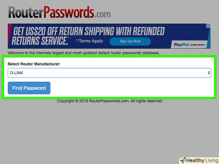 Знайдіть заводські логін і пароль для свого маршрутизатора. якщо ви все ще не можете увійти на сторінку конфігурації, перейдіть на сторінку www.routerpasswords.com і в меню виберіть "D-Link". У списку знайдіть свою модель маршрутизатора і скопіюйте відображувані ім'я користувача та пароль.