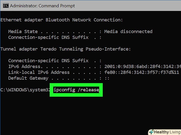 Введітьipconfig /release натисніть ↵ Enter.поточна IP-адреса буде видалена.