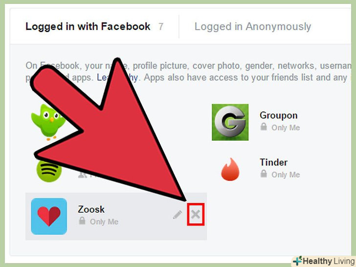 Видаліть Zoosk. знайдіть у списку Zoosk і натисніть" X " праворуч від цього запису. У вас запросять підтвердження на видалення. Якщо ви хочете видалити всю інформацію про діяльність Zoosk у вашому профілі, поставте відповідну галочку і натисніть " Видалити"[2].