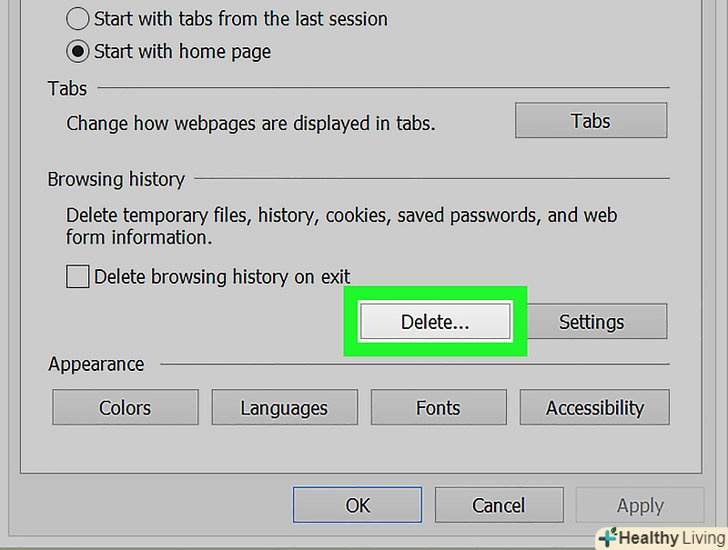 4. Клацніть поВидалити.ця опція знаходиться під» історія «посередині вікна»Властивості оглядача".