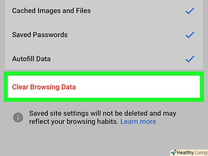 • Також буде видалена історія пошуку. Щоб видалити лише файли cookie, натисніть «Додаткові "у нижній частині сторінки, торкніться" дані веб-сайтів«, натисніть» Видалити всі дані веб-сайтів«, а потім торкніться»Видалити".