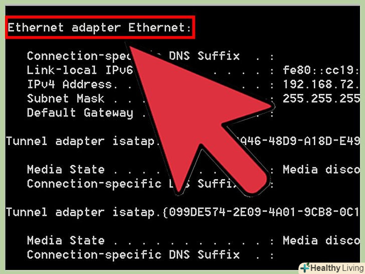 Знайдіть Активний мережевий адаптер (по його імені).на більшості комп'ютерів є один або два адаптери, але у вас може бути більше адаптерів. Якщо у вас є можливість підключитися до бездротової і дротової мереж, у вас буде як мінімум два адаптера.- Якщо адаптер не використовується, наприклад, до Ethernet-порту не підключений кабель, в рядкустан середовища відобразиться середовище передачі недоступне.