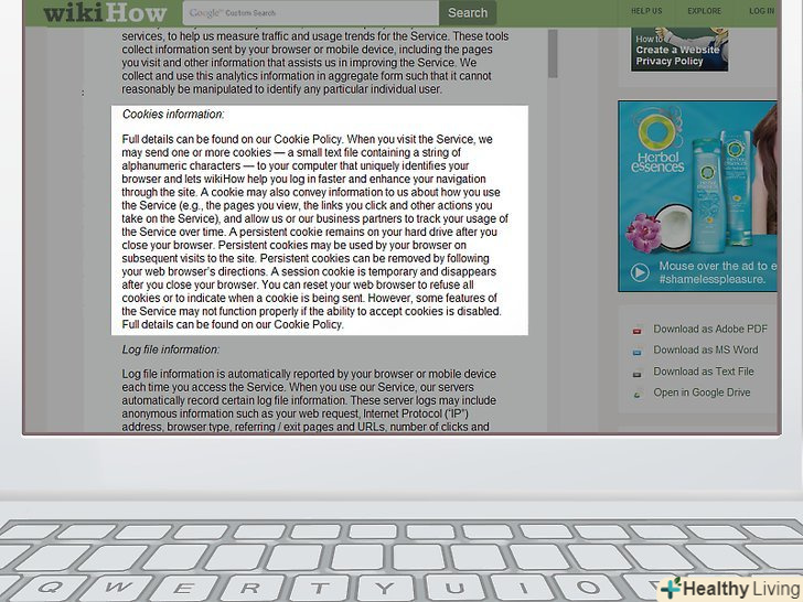 Уважно читайте умови Політики конфіденційності. Будь-яка компанія, яка отримує вашу інформацію, повинна використовувати політику конфіденційності з докладним описом дій з такою інформацією та обсягу, в якому ця інформація може бути розкрита іншим особам.[3]- Більшість людей ніколи не читають такі умови. Текст може бути громіздким, але варто хоча б пробігти умови очима, щоб знати, як будуть використовуватися ваші дані.