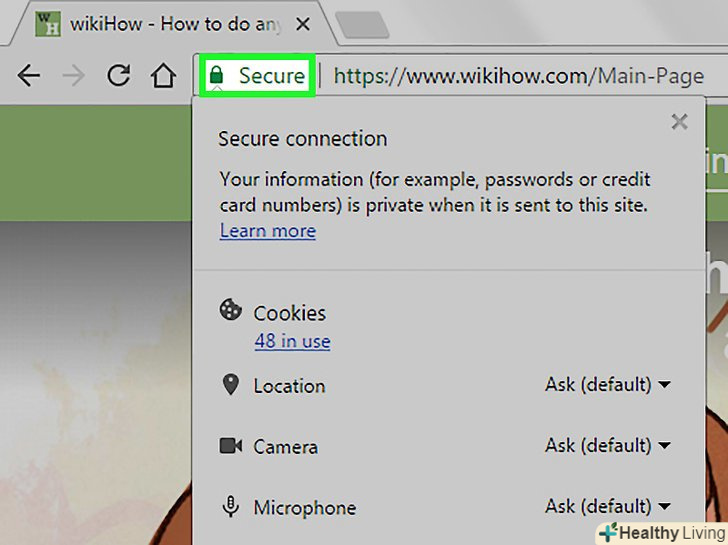 Погляньте на тип з'єднання. сайти з протоколом https, як правило, є більш захищеними (а тому і більш надійними), ніж сайти з більш поширеним протоколом http. Це тому, що незаконним сайтам немає діла до отримання сертифікації на відповідність вимогам інформаційної безпеки.[1]- Сайт з протоколом https все ще може бути ненадійним, так що не забудьте перевірити його іншими способами.[2]