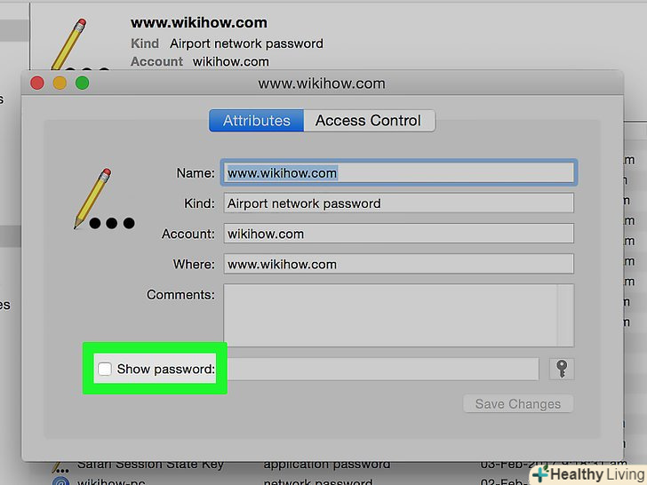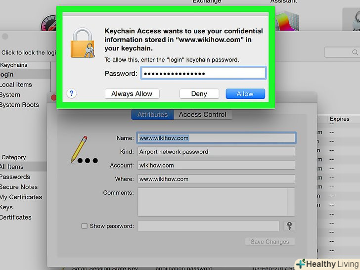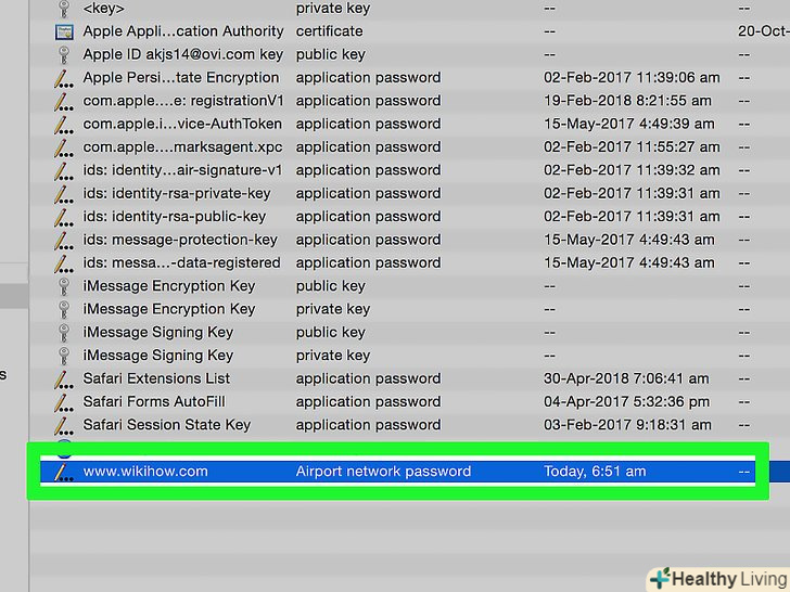 Знайдіть ім'я своєї бездротової мережі і двічі натисніть на нього. це ім'я відображається, коли ви підключаєтеся до бездротової мережі.- Список Зв'язки ключів можна відсортувати в алфавітному порядку-клацніть по "Ім'я «вгорі вікна»Зв'язка ключів".