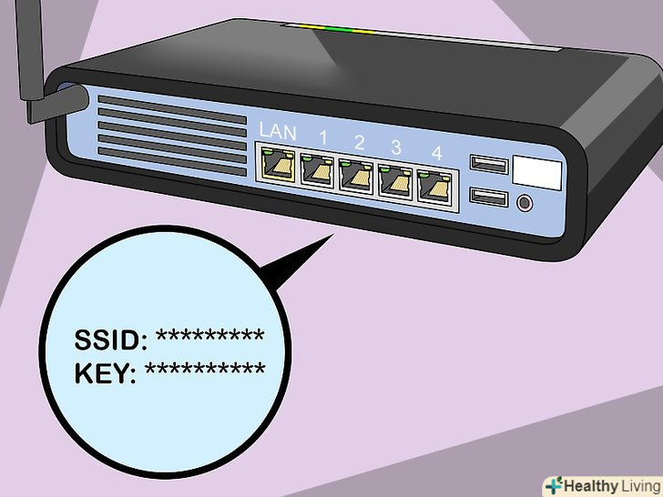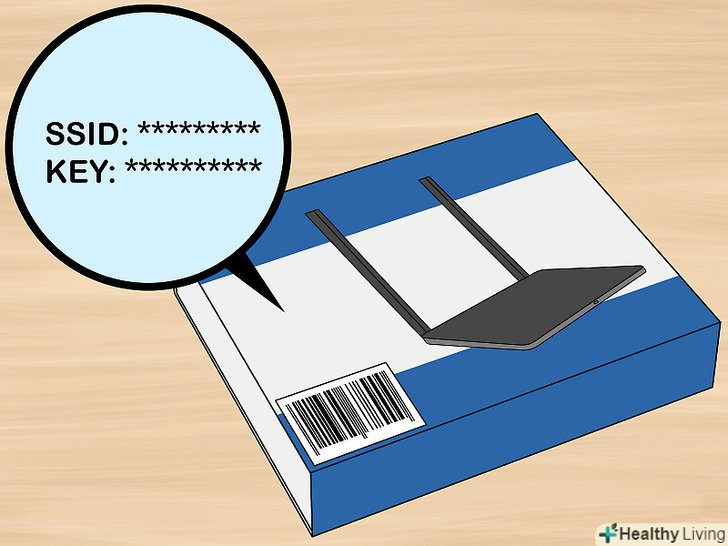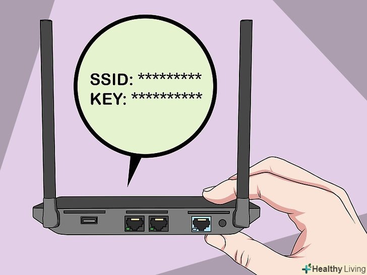 Пошукайте пароль на корпусі маршрутизатора.як правило, пароль вказаний на наклейці, яка знаходиться на задній або нижній панелі маршрутизатора.[1]- Шукайте пароль поруч із літерами "SSID".