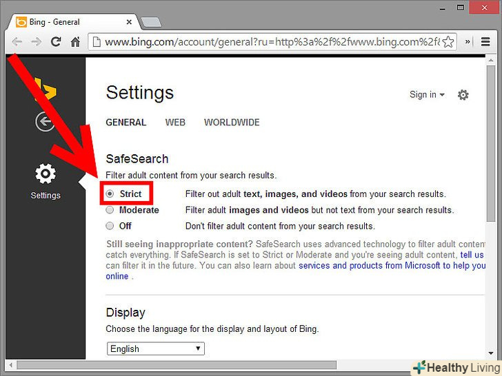Перейдіть на сторінкуПараметрів Bing.com . виберіть російську мову. Вгорі сторінки є налаштування Безпечного пошуку. За замовчуванням стоїть опція помірний. Для більш безпечного пошуку виберіть опцію Строгий.- Тут фільтрація набагато краще, ніж в Google, наприклад, якщо задати пошук по слову «секс», результатів буде нуль. Bing не просто фільтрує, але і зовсім забороняє такий пошук. У цьому його різниця з Google.