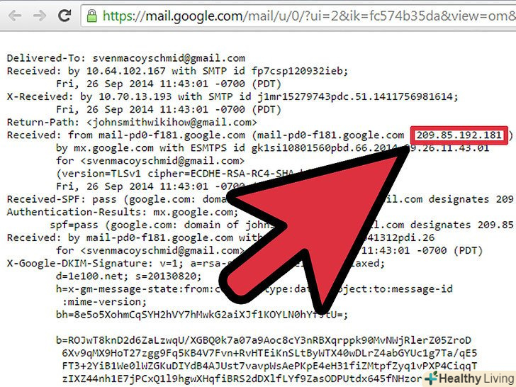 Знайдіть IP-адресу. IP-адреса складається з чотирьох чисел, розділених точками. Як правило, перед адресою буде написано» Received from " (отримано від). Шукайте щось схоже на « "98.34.56.4"»