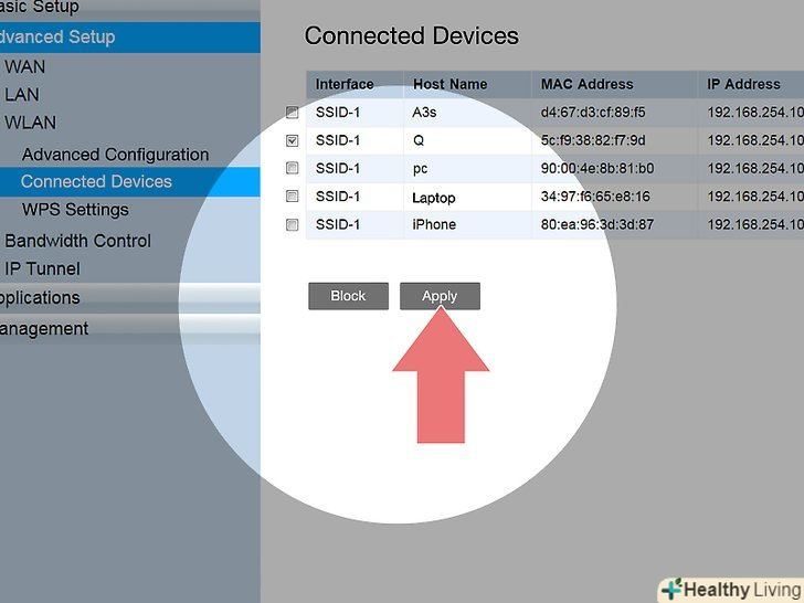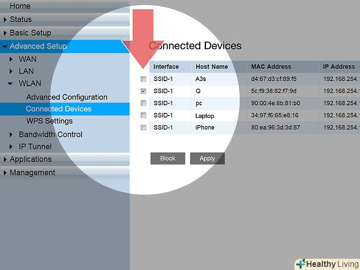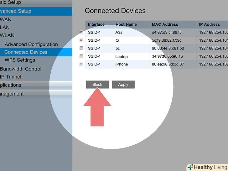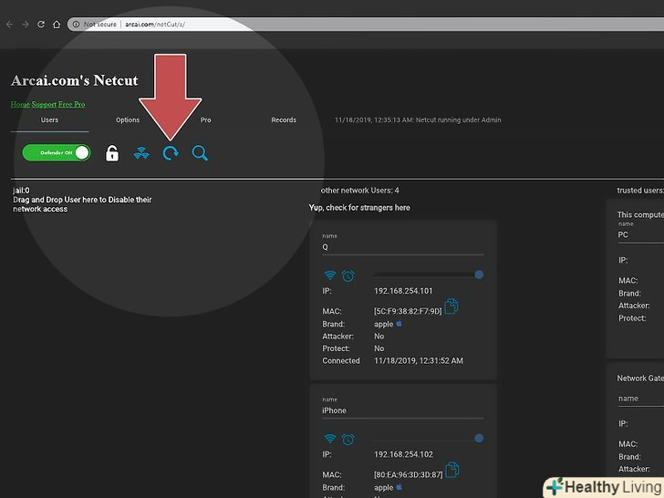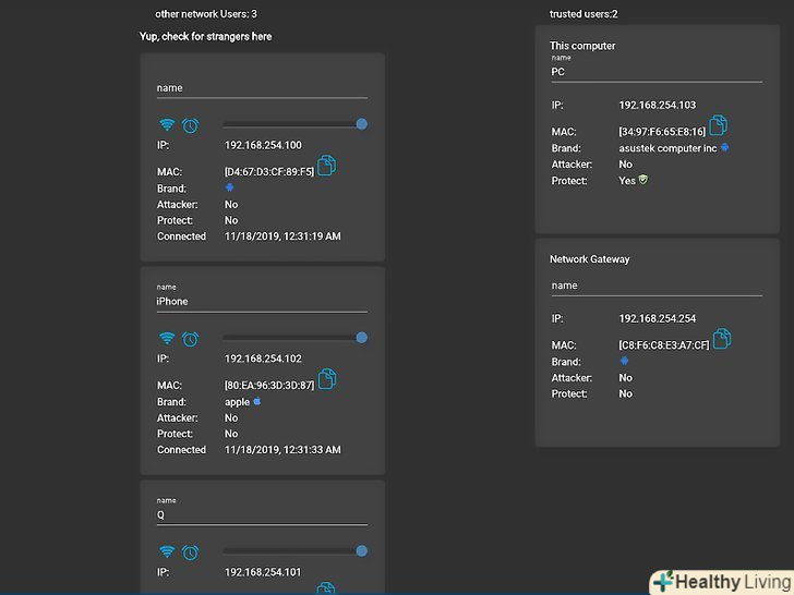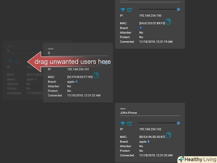 Видаліть сторонній пристрій зі своєї бездротової мережі. перетягніть невідомий пристрій в ліву частину сторінки. Воно відобразиться на лівій панелі програми — це означає, що стороння людина за допомогою цього пристрою більше не зможе підключитися до вашої бездротової мережі.- Повторіть описані дії з іншими незнайомими пристроями, підключеними до мережі.