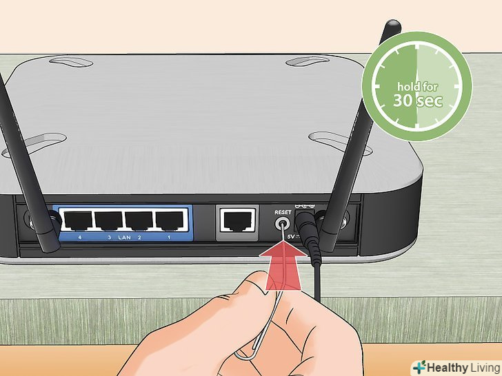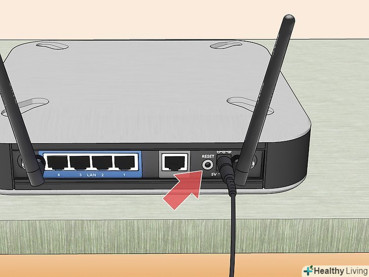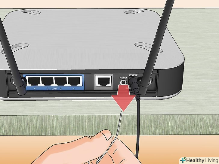 Натисніть " Reset "(скидання) на корпусі маршрутизатора.зазвичай ця кнопка знаходиться на задній панелі маршрутизатора. Ця кнопка не видно, тому уважно пошукайте її.- Як правило, кнопка "скидання" втоплена, а її діаметр трохи більше діаметра звичайної голки.
