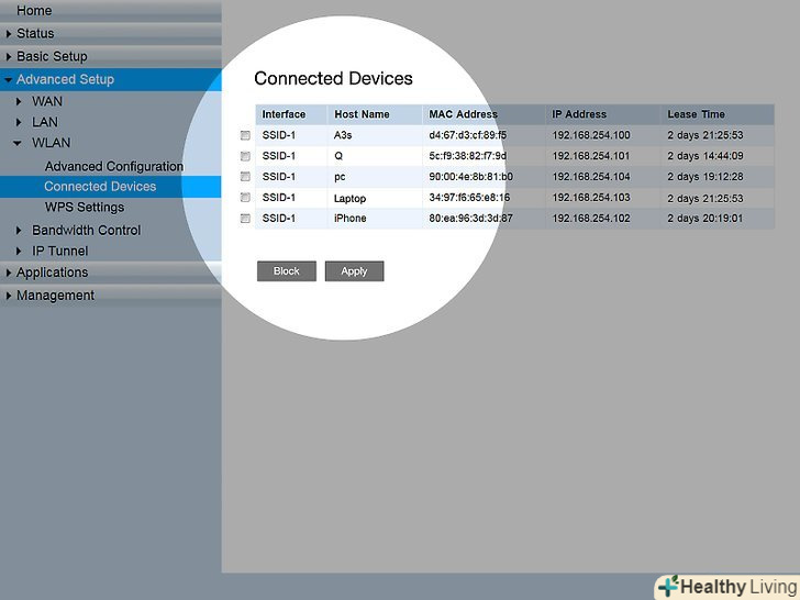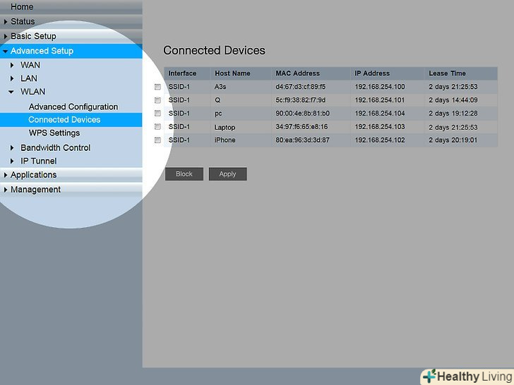 Знайдіть розділ з параметрами бездротової мережі.у ньому повинні бути перераховані всі поточні з'єднання. Шукайте розділ " Wi-Fi Connections "(Бездротові з'єднання), «Connected Devices» (підключені пристрої) або щось подібне.- На деяких маршрутизаторах потрібно знайти розділ "Parental Controls" (Батьківський контроль).
