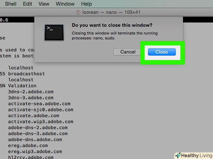 Збережіть внесені зміни і закрийте текстовий редактор. Для цього натисніть Control+o, а потім натисніть ⏎ return. Щоб закрити файл "hosts", натисніть Control+X.