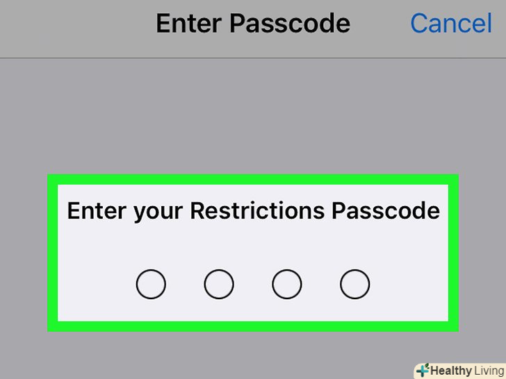 Введіть пароль до обмежень. це пароль, який ви встановили, коли активували обмеження (він не завжди збігається з паролем на вхід в пристрій).- Якщо обмеження ще НЕ ВКЛЮЧЕНІ, натисніть «Включити обмеження», а потім двічі введіть пароль.
