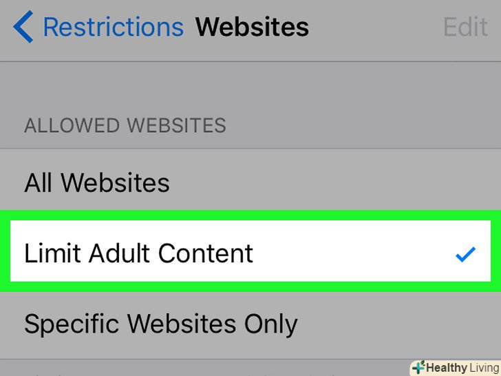 НатиснітьОбмежити доступ до сайтів для дорослих. ця опція знаходиться у верхній частині сторінки. Праворуч від опції з'явиться синя галочка, тобто опція включена.
