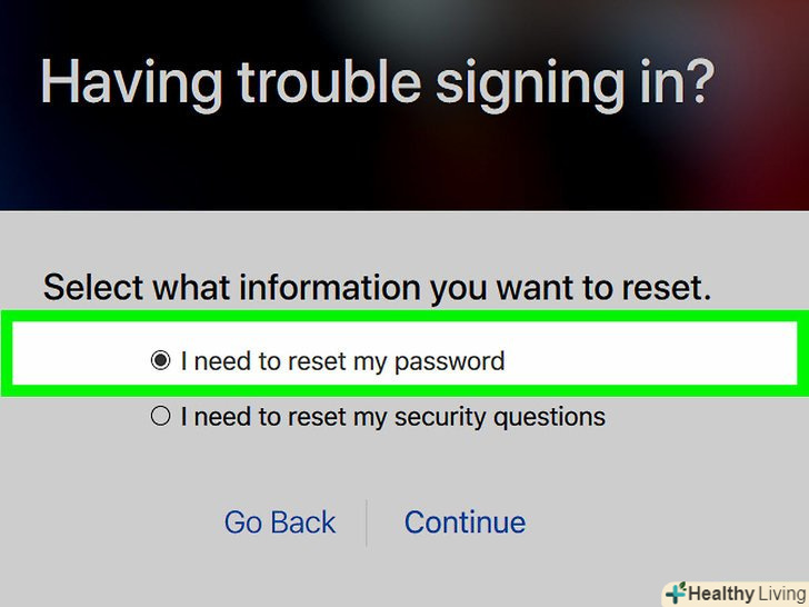 Виберіть один із способів перевірки особистості.виберіть, Як отримати дані для входу - по електронній пошті або відповівши на два контрольних питання..- Якщо ви вирішите скинути пароль по електронній пошті, повідомлення буде відправлено на вашу поточну адресу, а також на будь-які інші адреси, прив'язані до Apple ID.
